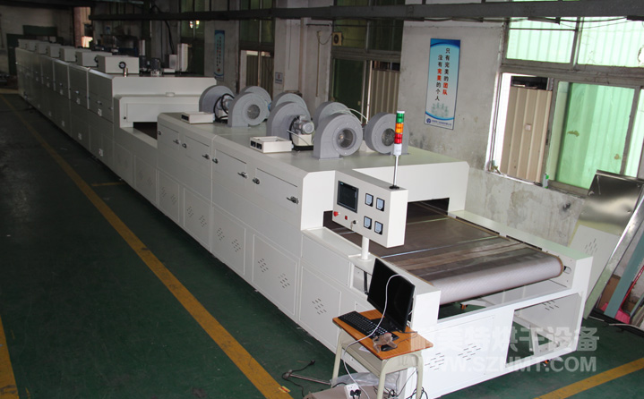 2、外形尺寸(約):總長24500mm*總高1740mm*總寬1890mm,地面到網帶的高度為950-1050mm,爐體內進料高度為150mm;烘干部分總長14000mm,分7段獨立控溫(每段4個測溫熱電偶),每段2000mm。冷卻段長4000mm,UV區2000mm,前后緩沖區各長500mm,進料部分長2000mm,出料部分長1500mm, 爐體前后大梁上方裝有急停開關,共4個。